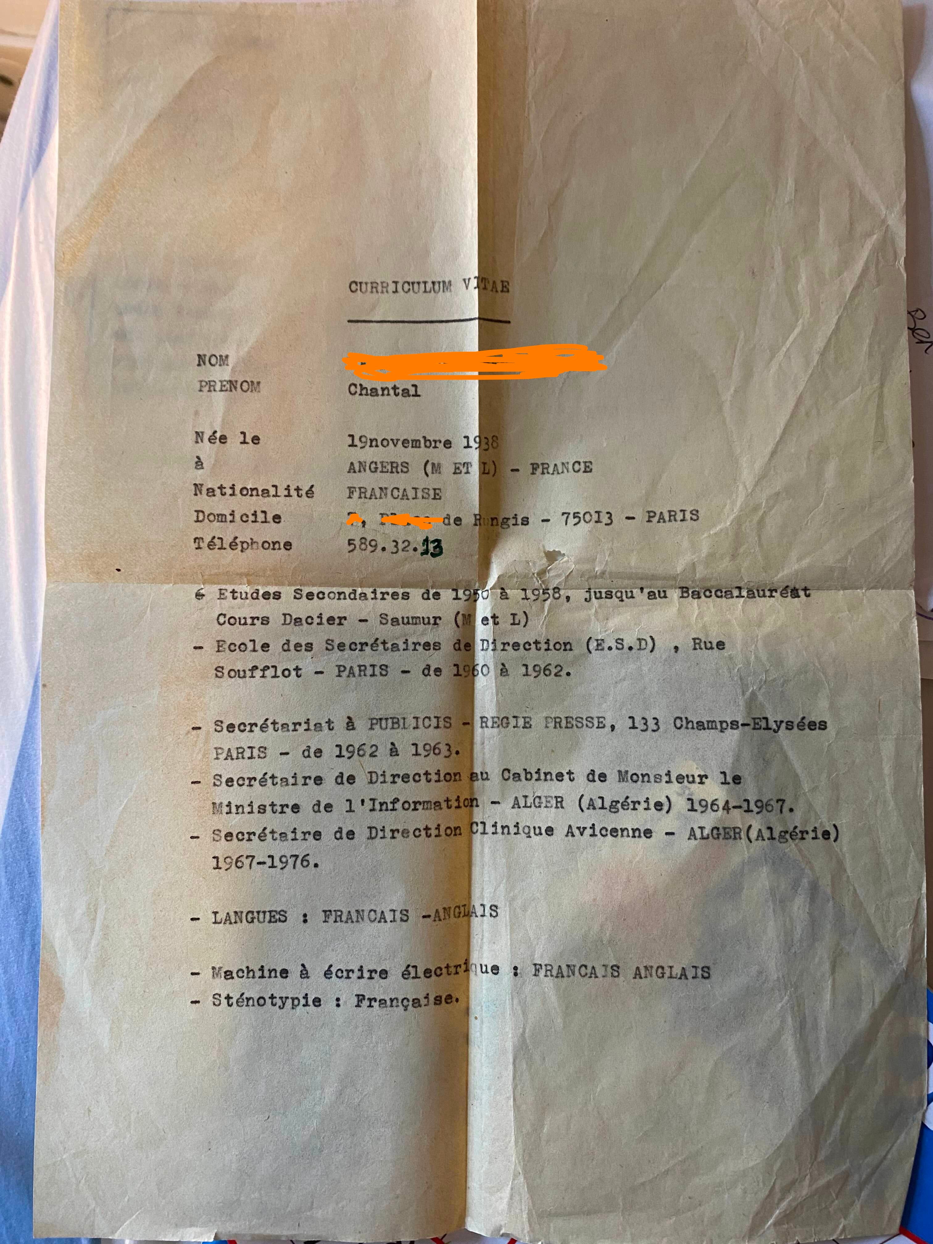 Dans les boîtes blanches que j’ai conservées chez moi, il y avait un CV. Le CV de ma mère.
